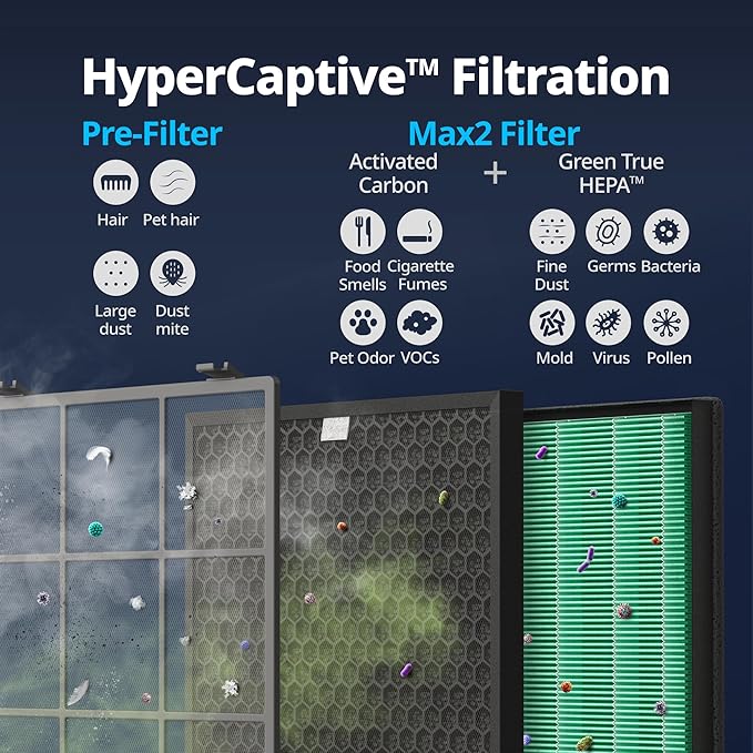 - [HyperCaptive Filtration System] Combination of a pre-filter, deodorization filter, and True HEPA Filter reduces 99.999% of 0.01-micron particles, including pollen and other allergens. It also reduces 99% of volatile organic compounds and odor.