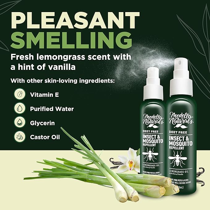 - DEET FREE BUG SPRAY – Unlike DEET bug sprays, Medella protects you from gnats, black flies, no-see-ums, and mosquitoes using lemongrass essential oil – no harmful chemicals. Our insect repellent spray is also non-flammable and grass-safe.
