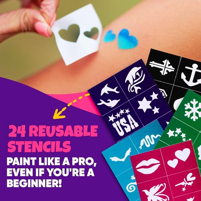 - 🎨 𝗖𝗢𝗠𝗣𝗟𝗘𝗧𝗘 𝗙𝗔𝗖𝗘 𝗣𝗔𝗜𝗡𝗧 𝗞𝗜𝗧: Unleash creativity with 28 vibrant color face painting kit for kids, 24 reusable stencils, 100 gem stickers, 2 body glitter pots, 3 brushes, 4 sponges, & a 16-design booklet & bonus rainbow split cake - fun for the whole family! A fun Halloween face paint kit with stencils and Halloween face paint kit for adults. Please note: Packaging may vary