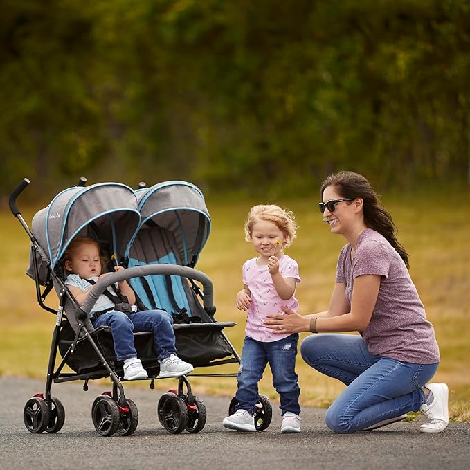 Dream On Me Volgo Twin Umbrella Stroller in Blue, Lightweight Double Stroller for Infant & Toddler, Compact Easy Fold, Large Storage Basket, Large and Adjustable Canopy