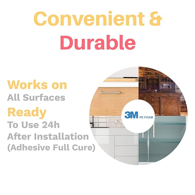 - Hassle-free installation: No tools required! With pre-applied 3M adhesive just peel the film, stick it on and you are all set for baby proofing your drawers and cabinets in less than 5 minutes.