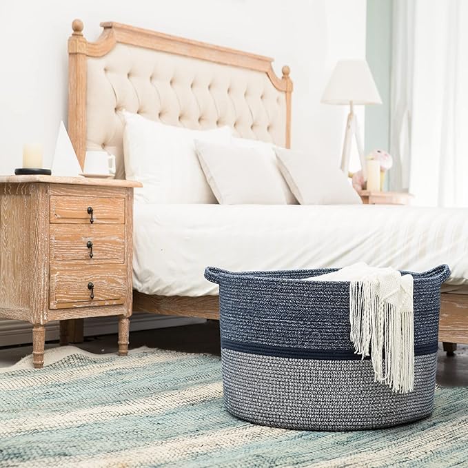 - 【Modern Design & Home Decor】 The woven storage basket can be used in every room. Their sleek, sophisticated shape and beautiful color navy blue and gray stitching will complement any decor. It can be placed for kindergarten, bedroom, bathroom, laundry room, balcony, etc.