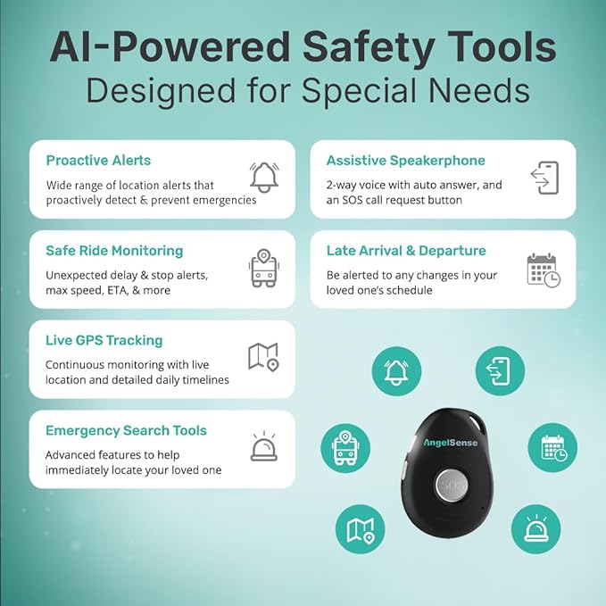 - INTELLIGENT ALERTS: Only AngelSense Auto-Learns daily routine for alerts when potentially dangerous situations occur: Early Departure, Unexpected Places, Late Arrival, Late Departure | SAFE RIDE MONITORING: Live Route, Max Speed, ETA, Unexpected Delays & Stops, Know if they miss the bus, get off at the wrong stop, the bus breaks down, or got off the bus but didn’t go into school. Standard GPS devices only provide alerts for preset geofences, we monitor your loved one anywhere & everywhere!