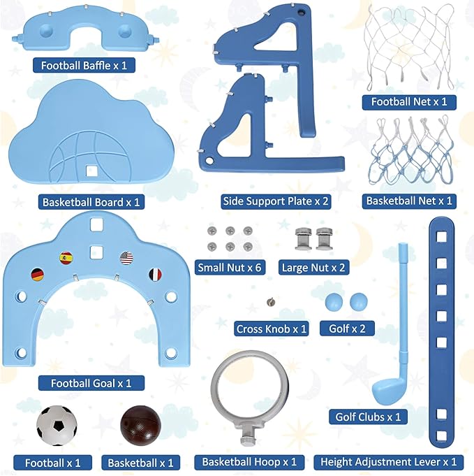 - 【3-in-1 Activity Center】 This kids basketball hoop has three sports to play, including golf game, basketball game and soccer goal game. It also comes with 1 basketball,1 soccer ball,2 golf balls and 1 golf club. By playing by themselves or with friends, children can gain unlimited joy and develop motor skills!