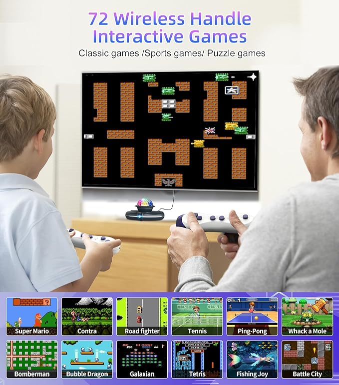 - PLUG AND PLAY : Enjoy offline play instantly—no internet or Wi-Fi needed! Simply connect via HDMI to your TV/ PC/ projector in just 5 minutes. Upgraded IC chip delivers ultra-smooth 4K visuals. The built-in 9 AR camera games, smart camera captures your every move, rendering your figure in real-time on the screen for an immersive experience. The disco ball lights create instant club vibes. Host epic kids’ birthday battles or family game nights effortlessly. Plus, two wireless controllers let you play solo or battle it out with friends!