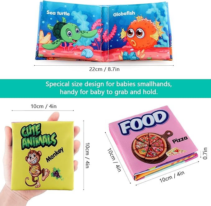 - ❤ [INTERESTING CLOTH BOOK DESIGN] Size: 4*4 inch baby picture book, textured fabrics and bright colors help to cultivate children's sensory perception, full of interactive elements, your baby's attention will be more durable, very suitable for infants and toddlers make the colorful photos and like soft sides. The soft cloth book feels extremely soft and is easy for small hands to hold.