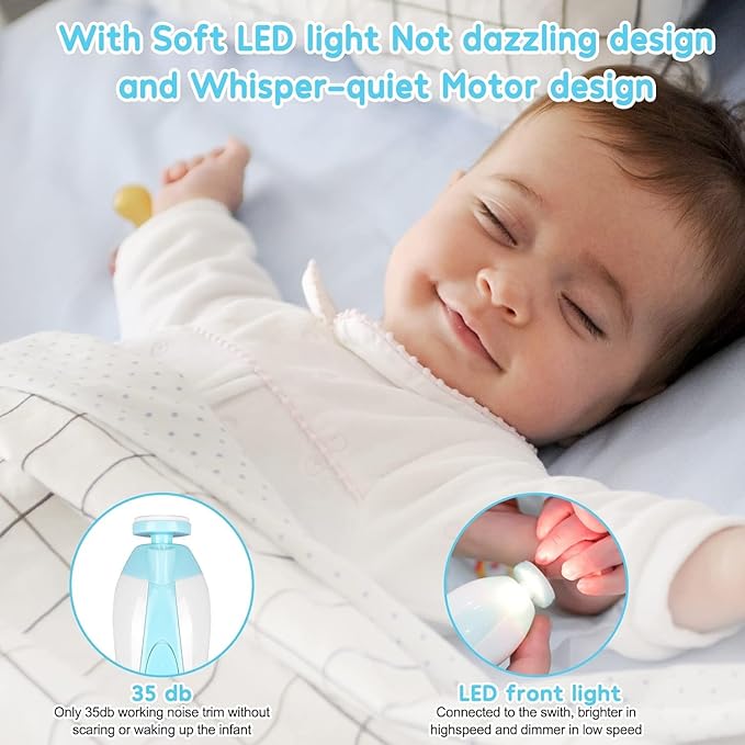 - Low Noise: Baby electric nail trimmer is equipped with a whisper-quiet motor. Only 35dB operating sound. You can file nails even as the baby sleeps, without causing any disturbance. You can use it in the dark at night
