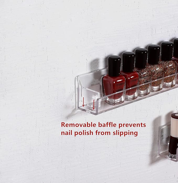 - ANTI FALLING BAFFLE:Designed with 2 removable stop inserts on the nail polish rack ends to keep bottles from falling out the sides of acrylic shelf