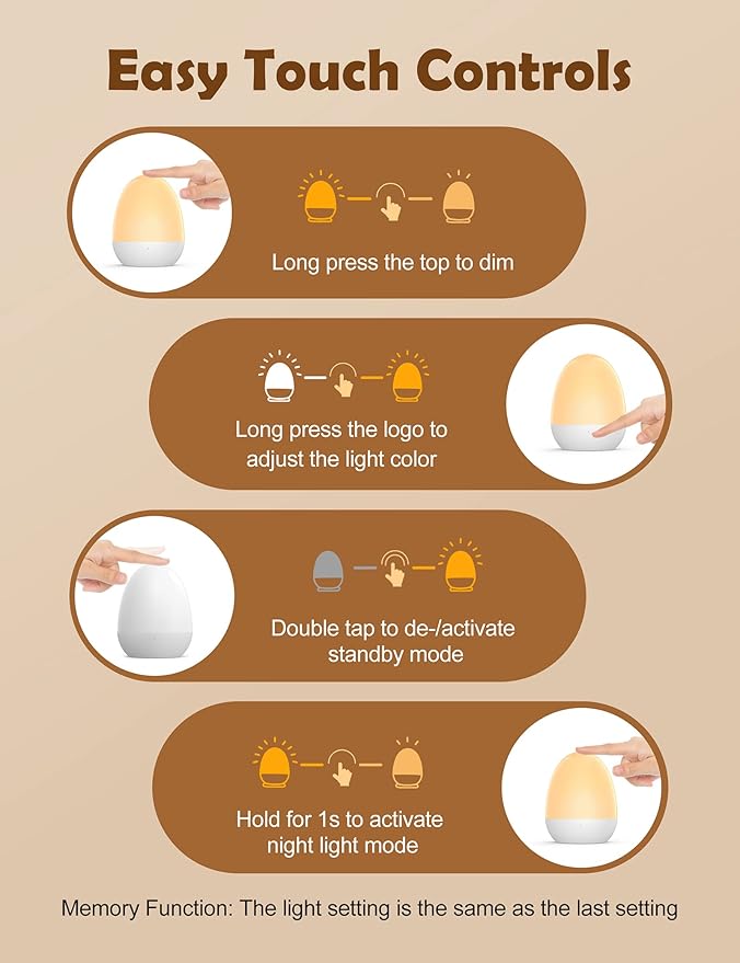 - Easy & fun Touch control: touch The top for 0.5 seconds to enter night light mode for breastfeeding at night; tap the logo twice to set a 1 hour timer to comfort your toddler to sleep