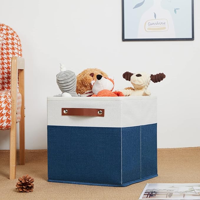 - 【Premium Material】The fabric used in the 11 inch fabric storage cubes bins baskets for shelves is fashionable and breathable, sturdy, breathable fabric materials with no peculiar smell, and the cardboard inside is strong and easy to fold. These organizing closet storage bins are sturdy enough to hold your stuff well. The leather handle is sturdy and easy to carry