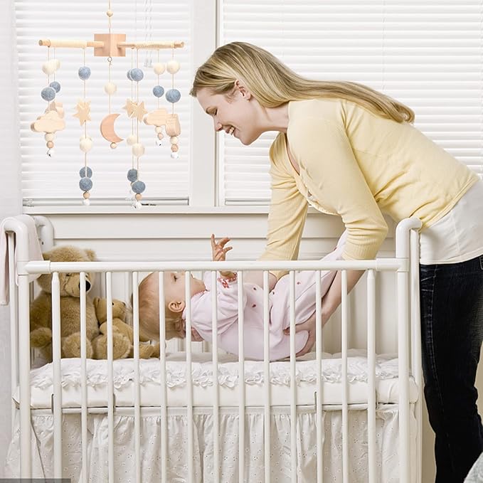 - 🌟【Engage & Delight Baby】:The gently swaying crib mobile will encourage your baby to focus and track, and the offset appendages help your little one explore the world to develop depth perception.They can be hung from hook in the ceiling or you can use a mobile arm attached to the baby crib,this not only helps your baby’s promote auditory, motor development and visual stimulation, and has a calming effect as baby settles into the crib or wakes from sleep.