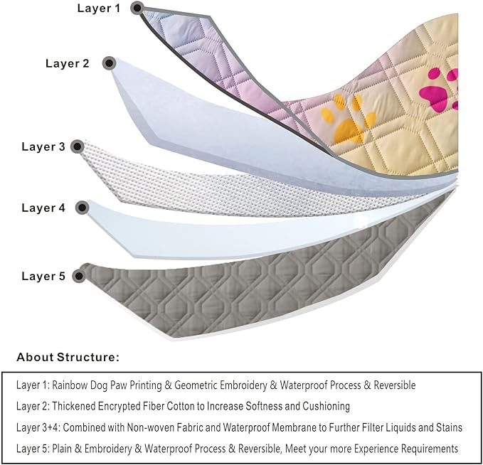- The Rainbow Dog Paw Printed PetBed Blankets is Made of 5 Layers of High-density Composite Materials. TheSurface + Bottom are Geometric Embroidered + Color Matching Printed with Rainbow Dog Paw Printed + Water Resistant + Reversible + Reusable + Brushed. It NotOnly has a Three-Dimensional Luxury Visual Enjoyment, But Also Doubles the Prevention of Liquid Stains.Leakage, Feel Upgraded to be More Comfortable and Fit.