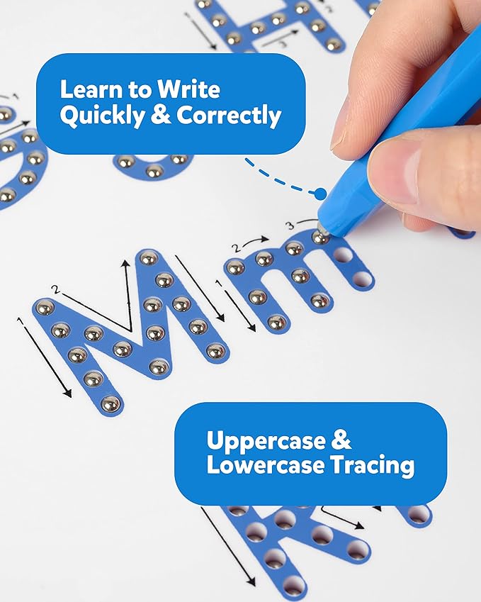 - Mesmerizing Writing Toy: The magic writing board with lead-free ABS material made a safer toy for kids. A forceful enough but not super magnetic stylus is appropriate to attract those metal balls to pop up while adding a smooth tactility for letter-tracing. Teaches capital letters, lowercase letters, letter strokes, and much more!
