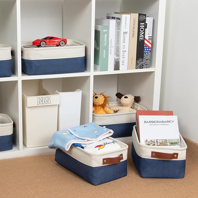 DULLEMELO Set of 6 Small Baskets for Organizing, Small Fabric Storage Bins for Toys Storage, Collapsible Storage Bins with Leather Handles for Shelves, Closets, Laundry, Nursery(White&Blue)