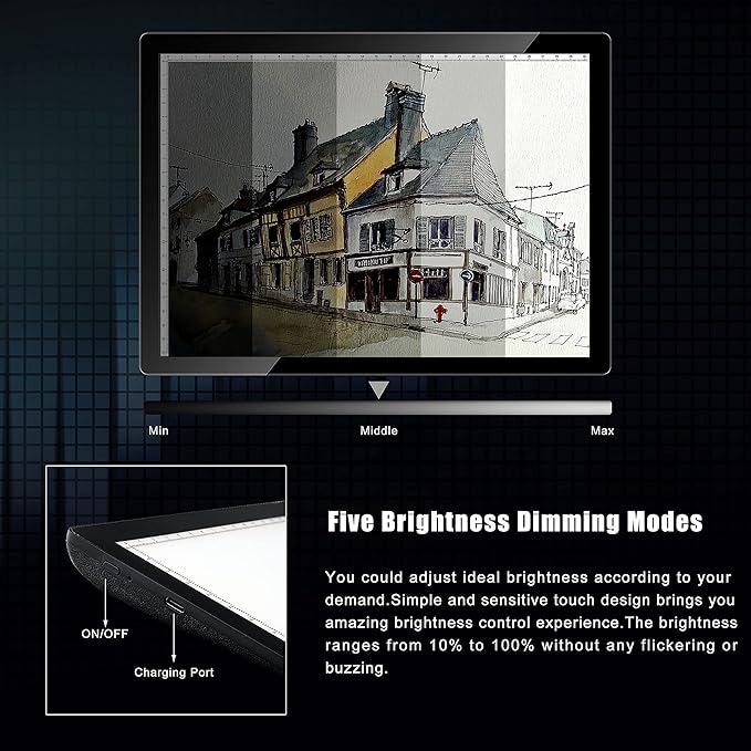 - 【5-LEVEL BRIGHTNESS & SIDE BUTTON】 With the 5-level light setting, you can adjust the table lighting according to ambient lighting and paper thickness/weight to suit your projects. The button is designed on the side, so you won't turn on/off the light pad accidently any more.