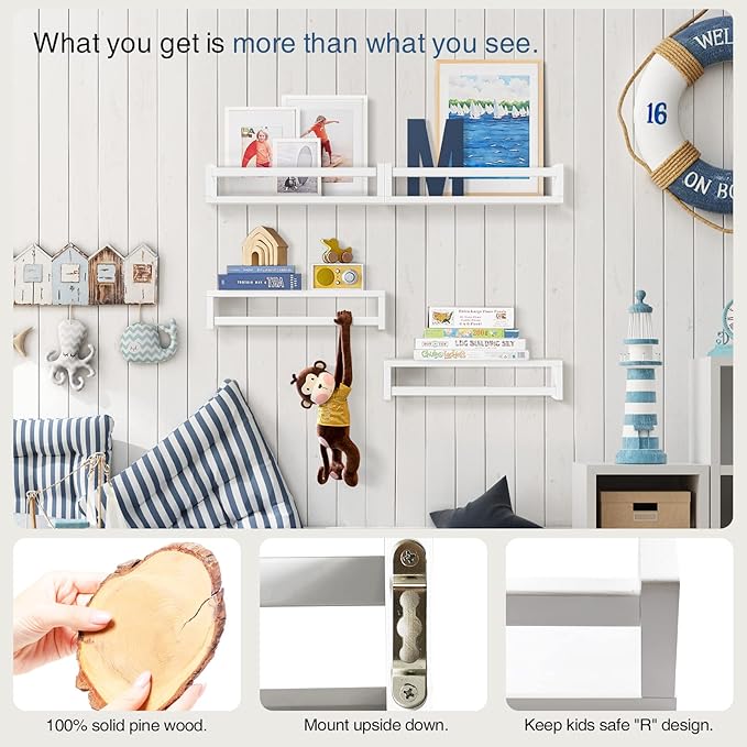 - [Great for Nursery and Kids Room] Mount these floating shelves on your nursery wall, Kids can stow books, toys, stuffed animals and games in wall shelving, where theyโll be off the floor and easy to reach.