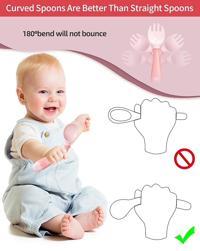 - [Ergonomic Design] The tableware is specifically made to help babies with their grip training. It can bend in any direction without rebounding, enabling the infant to eat at different angles and encouraging the development of agility and hand-eye coordination.