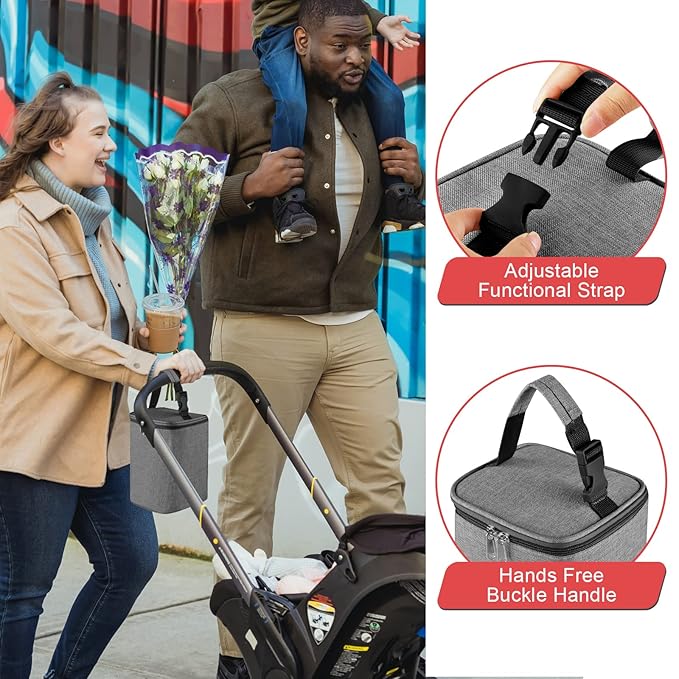 - PORTABLE WITH DETACHABLE BUCKLE: The detachable buckle design of the reusable baby bottle bag ensures you two portable carry ways, handhold or hanging on a stroller, together with soft nylon handle, let you carry the bottle bag effortlessly and comfortably.