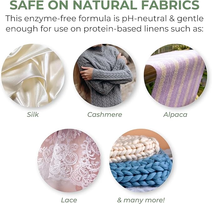 - Specially Formulated: Gently and effectively clean your clothing, lingerie, bedding, and more. Our eco-friendly laundry detergent is perfect for all your protein-based fabrics; silk, wool, cashmere, alpaca, camel, llama, washable furs, and more. Made with plant-based ingredients, this detergent is pH neutral, and safe for skin and fabrics.
