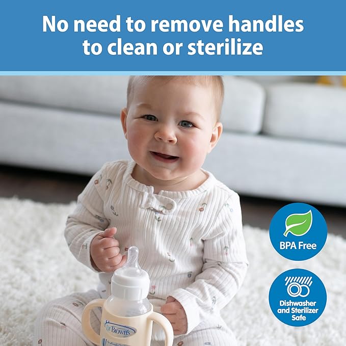 - GROWS WITH BABY. Introduce handles when baby is ready to start learning independent drinking skills. You can even transition the bottle to a sippy bottle by removing the nipple and adding a sippy spout or straw, sold separately.