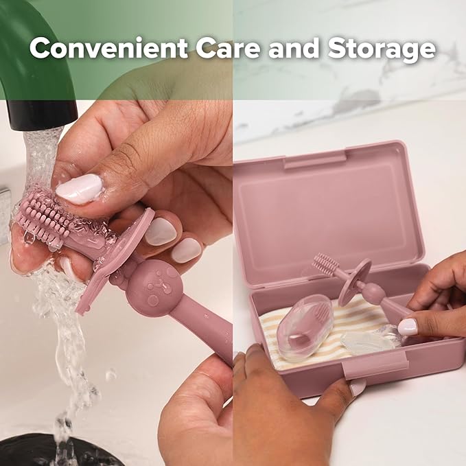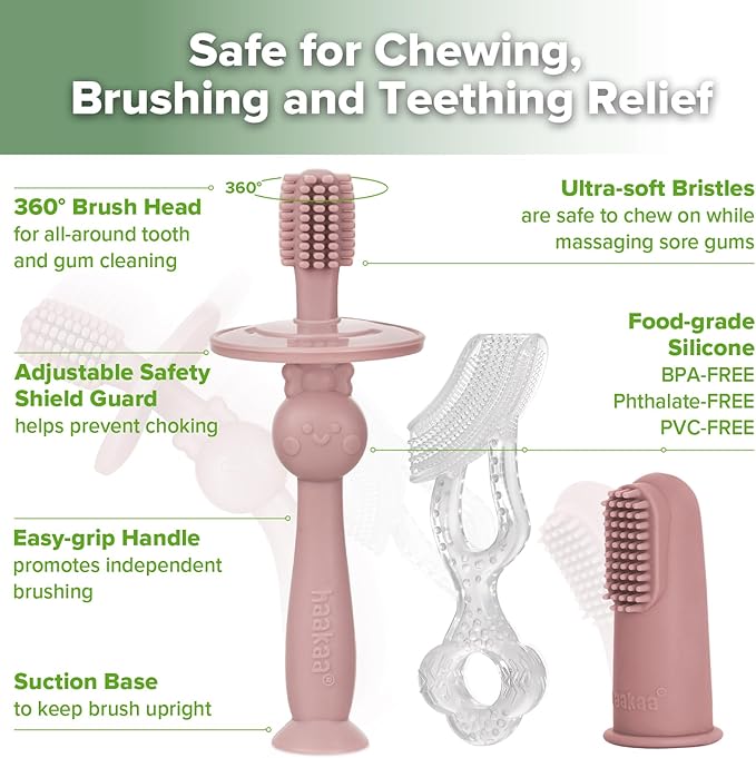 - 𝐒𝐭𝐚𝐠𝐞 𝟑: 𝟑𝟔𝟎° 𝐒𝐢𝐥𝐢𝐜𝐨𝐧𝐞 𝐛𝐚𝐛𝐲 𝐓𝐨𝐨𝐭𝐡𝐛𝐫𝐮𝐬𝐡 (𝟔 𝐦𝐨𝐧𝐭𝐡𝐬 𝐚𝐧𝐝 𝐮𝐩):Equipped with 360° bristles for an effective cleaning, a safety guard to prevent choking, and a suction base for upright storage.