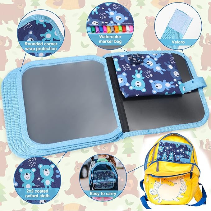 Erasable Doodle Set for Kids - Reusable Magic Drawing Book with 12 Watercolor Pens 14 Page Drawing, Road Trip Car Game Writing Painting Set for Boys and Girls (Bear)