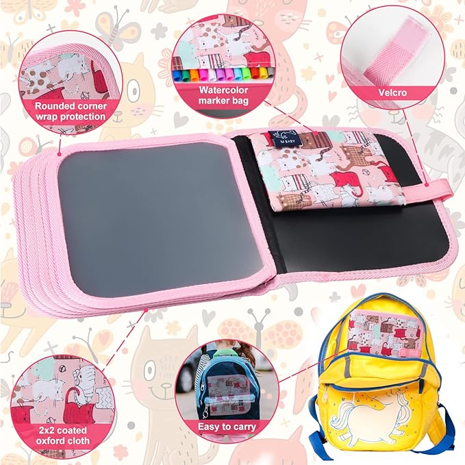 - 🎨Kid's Road Trip Essentials--Kids Erasable Graffiti Book has sticky buttons on the outside to keep it in place and a pens pocket on the inside for 12 watercolor pens. Even in cars, planes and other means of transportation, kids can draw as much as they want.