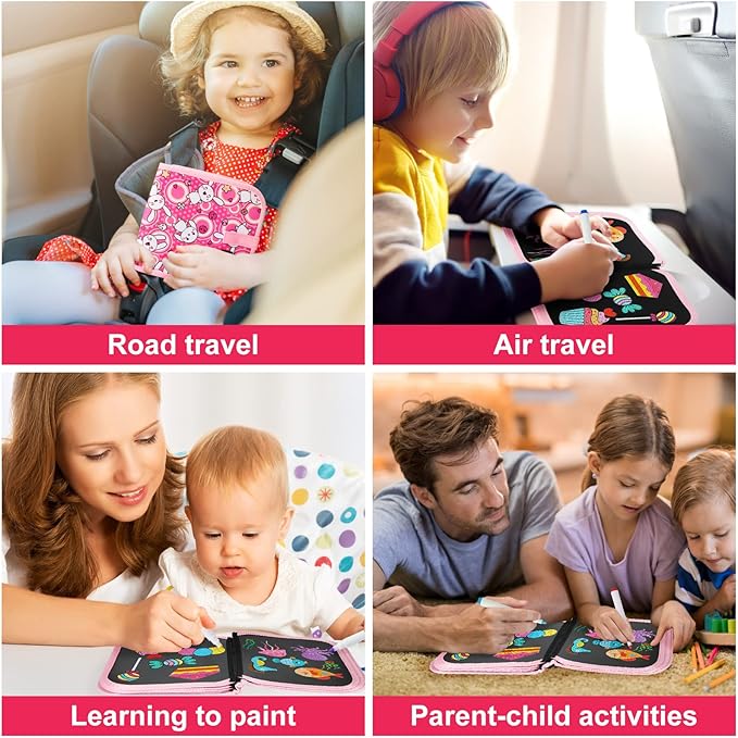- 🎨Kid's Road Trip Essentials--Kids Erasable Graffiti Book has sticky buttons on the outside to keep it in place and a pens pocket on the inside for 12 watercolor pens. Even in cars, planes and other means of transportation, kids can draw as much as they want.