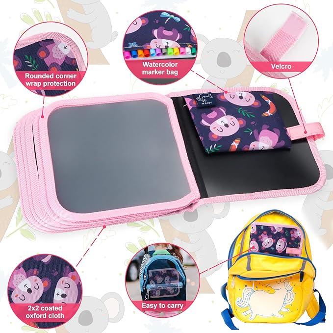 - 🎨Kid's Road Trip Essentials--Kids Erasable Graffiti Book has sticky buttons on the outside to keep it in place and a pens pocket on the inside for 12 watercolor pens. Even in cars, planes and other means of transportation, kids can draw as much as they want.