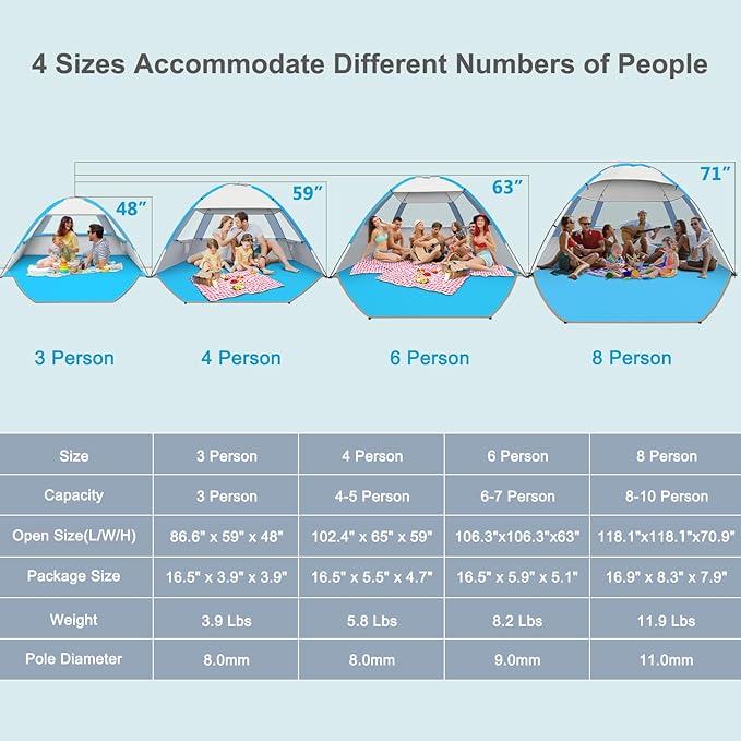- Super Large Space: Size of 118"L x 118"W x 71"H, 30% bigger than other instant tents at a similar price, fits 8-10 people. It provides a comfortable space for family and friends on the beach
