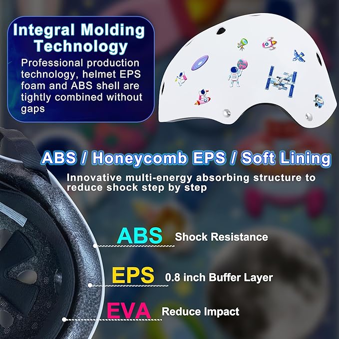 - 【Unique DIY Kids Helmet】 Toddler helmet included space themed stickers, your kids can enjoy and use their imagination to create their own customized bicycle helmet. With knee pads and elbow pads set, effectively protects your kids from injuries during multi-sports, not only protects the baby but also delights the mood. The designed bicycle helmet is a great gift for kids 3-8 years old. (One sticker picture will be given randomly)