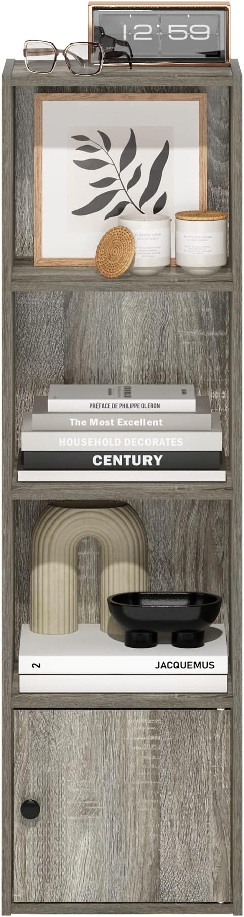 - Features 3 open shelves for display and storage. Closed cabinet at the bottom to keep your room away from clutter. Each shelf holds up to 15lbs.
