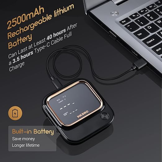 - 【Different Level Deluxe Design & Readable Backlit LCD Screen & Rechargeable 2500mAh lithium Battery】The bbq thermometer with luxury and outstanding design. The screen brightness can be adjusted via the app, the temp data are clear even under the sun. The large LCD screen displays the meat probe readings, ambient/oven temp, the setting temp, high/low temp alarms simultaneously. The built-in battery oven meat thermometer will last at least 40 hours after a 3.5 hours type-C cable full charge