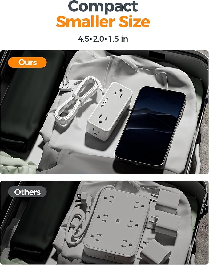 - 7 in 1 Small Power Strip: Extension cord with multiple outlets can be expanded to 4 AC Outlets (1250W Max), 1 USB C and 2 USB A; Low profile power strip with flat head extension cord 10ft can charge 7 devices at the same time, reducing waiting time
