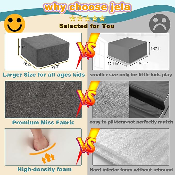 - 【SAFE AND GUARANTEED】: Jela foam climbing blocks are CertiPUR-US certified, non-toxic, environmentally friendly, and odorless fabric with OKEK-TEX approved. The soft play climbing for toddlers with hidden zippers are designed to avoid scratching children's soft skin. We focus on offering kids a reassuring environment to play, the product is built without hard structure or smooth edges, to prevent kids from bumping.