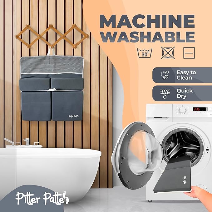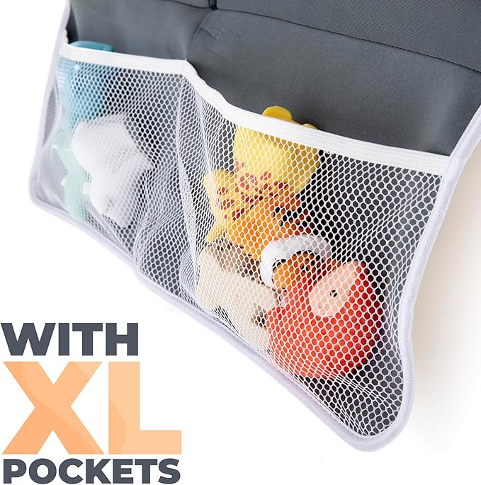 - [Extra-Large Foam Pad with XL Capacity Pockets] - This XL kneeling pad for bathing baby measures 22.2” x 11.3” which is longer and wider than most. Two 9" deep front pockets offer ample space for storing baby essentials for bathtime like shampoos, soaps, toys, and more. Two 6" deep back pockets offer bath toy organizer for tub so your toddler can play. Our baby knee pads and elbow rest pad will keep everything you need within arm's reach.