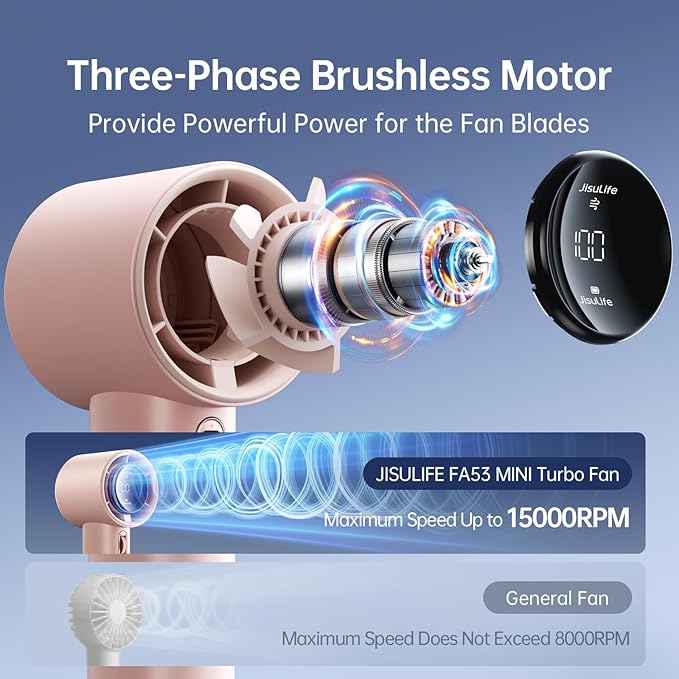 - Brushless Motor - Super Power: The combination of a three-phase brushless motor and a 3600mAh battery significantly improves the wind speed, power, and endurance. The maximum wind speed can reach 9m/s. The highest rotation speed of the handheld fan is three times that of a regular personal fan, reaching up to 15000 RPM. It can cool for 2-12 hours on a single charge