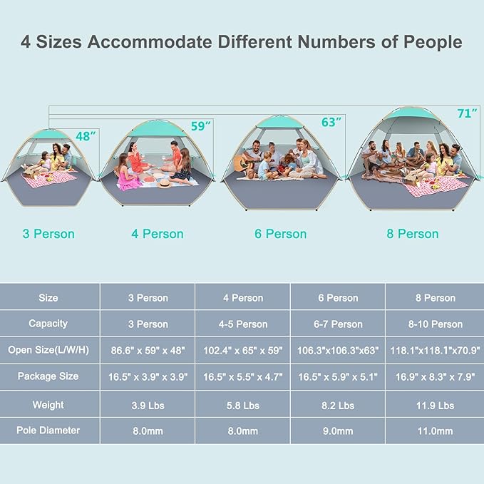 - Super Large Space: Size of 118"L x 118"W x 71"H, 30% bigger than other instant tents at a similar price, fits 8-10 people. It provides a comfortable space for family and friends on the beach