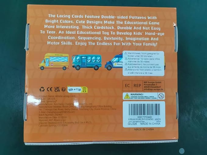 - Bright-colored & Eye-catching: The pattern covers different vehicles, like taxi, school bus, fire truck, police car, ice cream truck, bus, truck and ambulance. The patterns on cards are colorful, big and vibrant. The holes are clearly cut and easy for preschoolers to work with. The strings are easy for children to use and fit into the holes easily.
