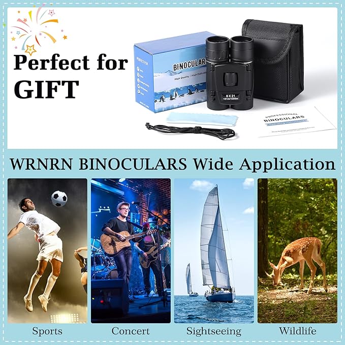 - 【Wide & Clear Vision】WRNRN 8X21 binoculars has 8X magnification and 369ft/1000yds large field of view. Use quality BAK4 Prism and FMC Green Lenses to inscrease the light transmission up to 98.5%. You can easily gain a better brightness, contrast and quality image.