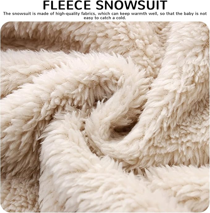 - ??Material: This baby snow suit flannel jacket clothes made of high quality polyester fiber, double lining, fine polyester fiber cares for baby's delicate skin. The newborn winter fleece outfit hoodie whole body jumpsuit design, keeps the baby's head and ears inside and warm when outing. The toddler boys & girls snow suit accompanies the baby through the cold winter.