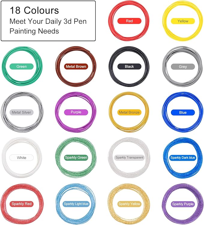 - Shining 18 Colors: This 1.75mm PLA 3d pen filament refills include 7 sparkly transparent color filament refills, 3 metallic color filament refills, 8 solid color filament refills. This muti color filament is an excellent gift for enthusiasts of 3D printing pen. Color list: red, yellow, green, metal brown, black, grey, metal silver, purple, metal bronze, blue, white, sparkly green, sparkly Transparent, sparkly Dark blue, sparkly red, sparkly light blue, sparkly yellow, sparkly purple,