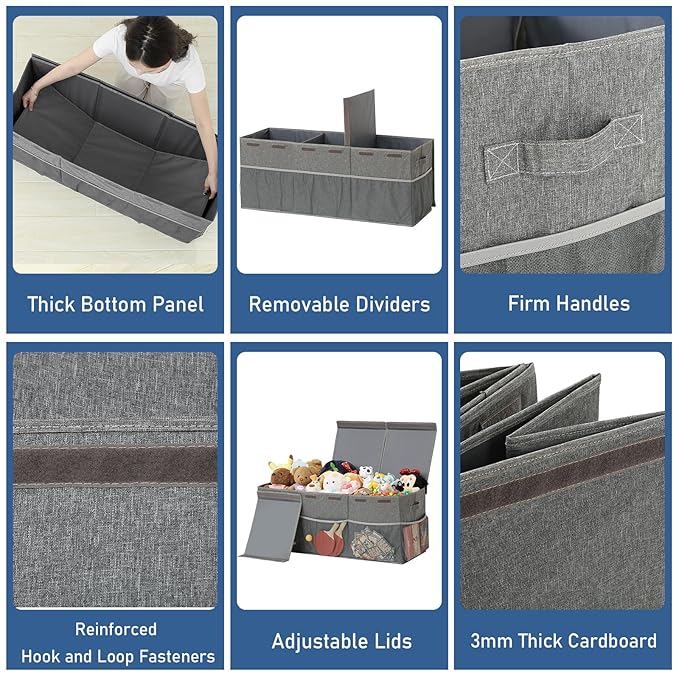 - 【Main Features】The hook and loop fastener flip-top lid of the kids toy box not only easy for kids to get toys but also prevents dust from entering. The removable hook and loop fastener divider is for category storage, which can be assembled into one large grid, two medium grids, or three small grids to classify different toys. Plus, The bottom cardboard is to enhance the solidity of the bottom.