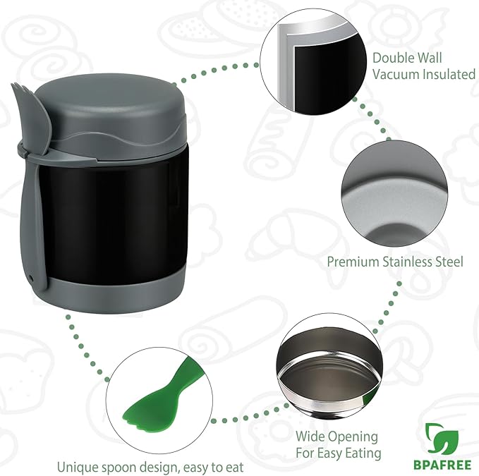 - Leak Proof Design: Feel confident that our leak-proof food jars will fit in your lunch bag without worrying about spilling messes. The insulated thermo food jar comes with a food-grade spoon for your child's convenience.
