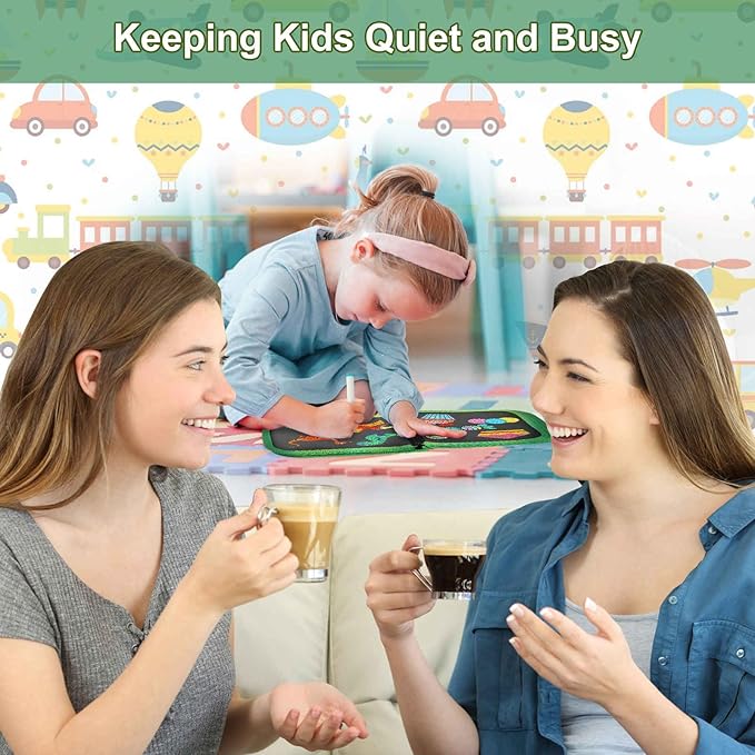 - 🎨Kid's Road Trip Essentials--Kids Erasable Graffiti Book has sticky buttons on the outside to keep it in place and a pens pocket on the inside for 12 watercolor pens. Even in cars, planes and other means of transportation, kids can draw as much as they want.