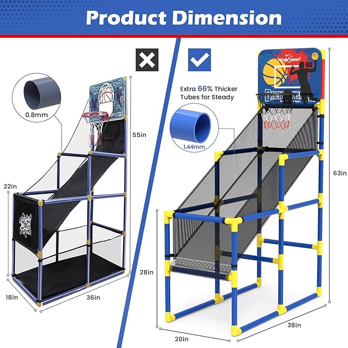 - 【Sturdy Material】This kid's indoor basketball hoop toy ( 38 "L x 20" W x 63" H ) is durable and stable, constructed with premium pipes(66% thicker than others ). The upgraded reinforced hoop can last for a long.