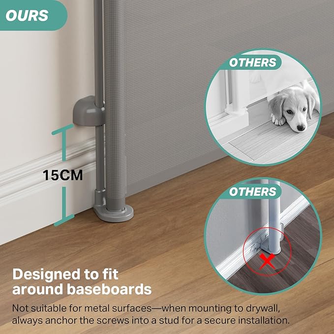 - New Safety Locking: The knob at the top of the mesh gate ensures that the retractable pet gate is easy to use for adults and can be opened and closed with one hand, while curious babies and pets will not be able to make any naughty bids for freedom. For best performance, remember to lock the latch after installation to fully tighten the mesh and ensure stability.