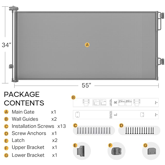 - Easy Hardware Installation: With the tools provided, you can have your new mesh retractable gate installed in minutes. Brackets, wall anchors, and screws make installation a hassle-free process. (Note: Not suitable for metal surfaces. When mounting to drywall, always anchor the screws into a stud for a secure and safe installation.)