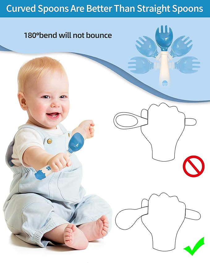 - [Ergonomic Design] The tableware is specifically made to help babies with their grip training. It can bend in any direction without rebounding, enabling the infant to eat at different angles and encouraging the development of agility and hand-eye coordination.