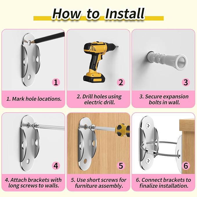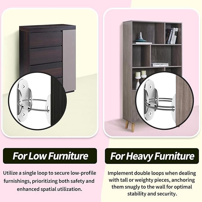 - Versatile Protection: Safeguard your space by anchoring furniture items such as bookcases, dressers, cabinets and wardrobes to the wall, effectively reducing incidents with curious toddlers. The detachable anti-tip anchor offers flexibility, allowing easy removal for cleaning or furniture repositioning.